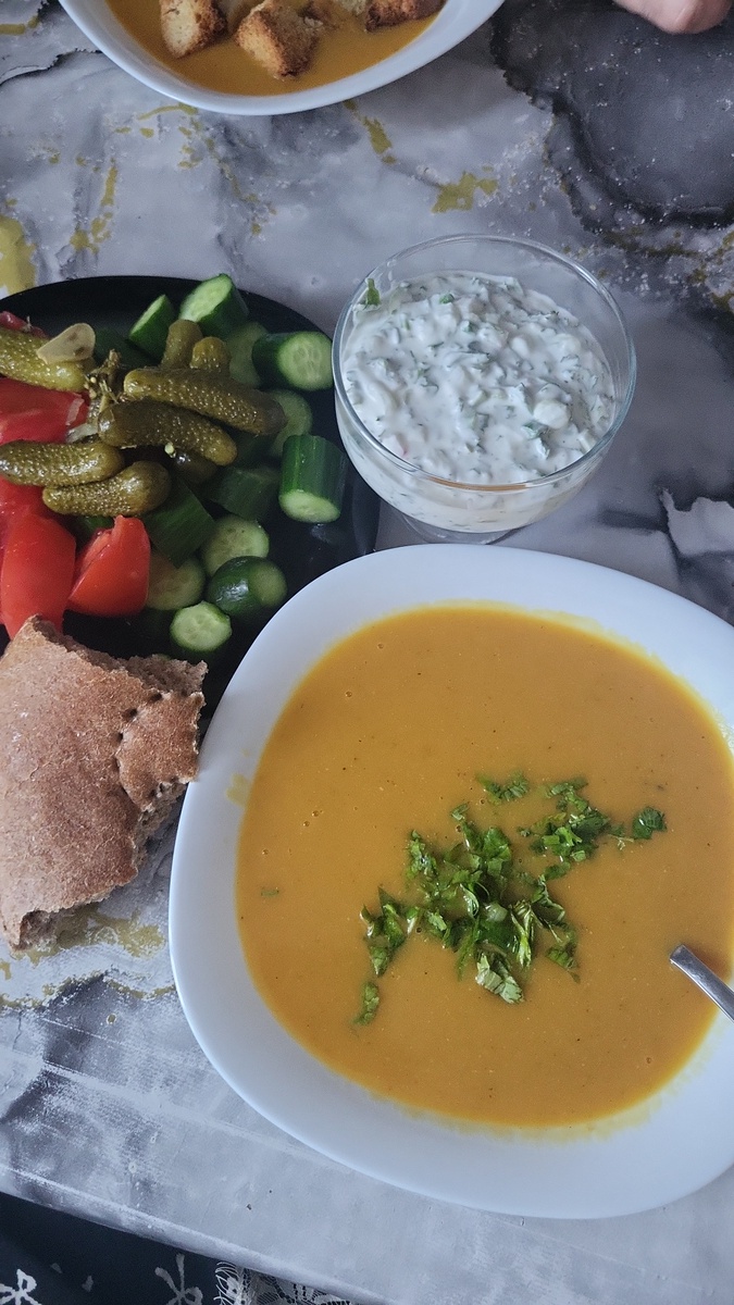 Суп мерджимек с помидорами и огурцами. Лепешку больше половины не съела.