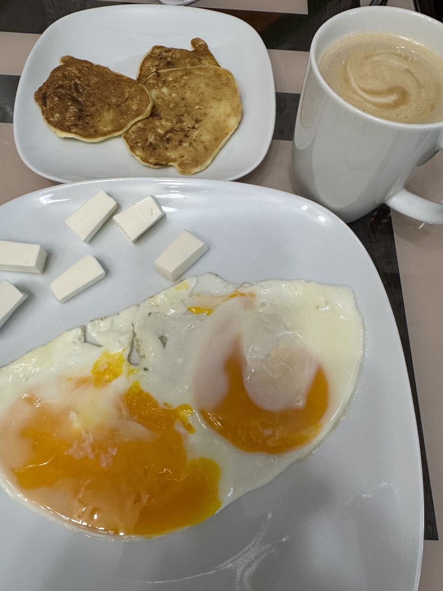 яичница, сыр фетакса, кабачковые оладьи, кофе с молоком.