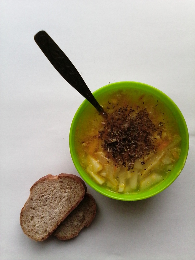 Сегодня мой обед состоит из щей и двух кусочков отрубного хлеба.