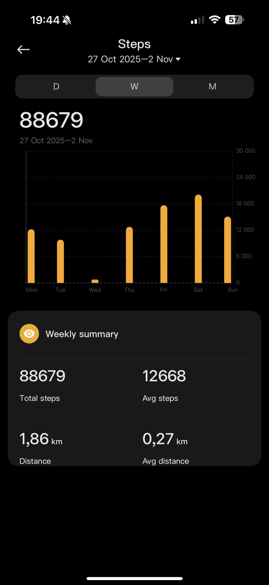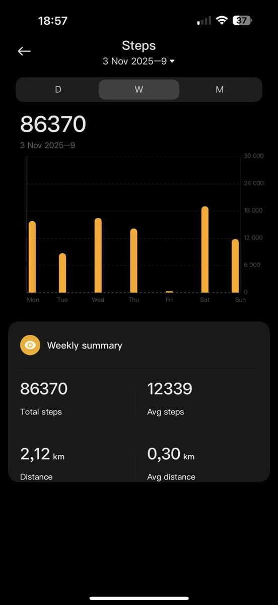 Не синхронизировала шаги в среду, а там было около 9 тысяч. Но даже несмотря на это получился хороший показатель за неделю.