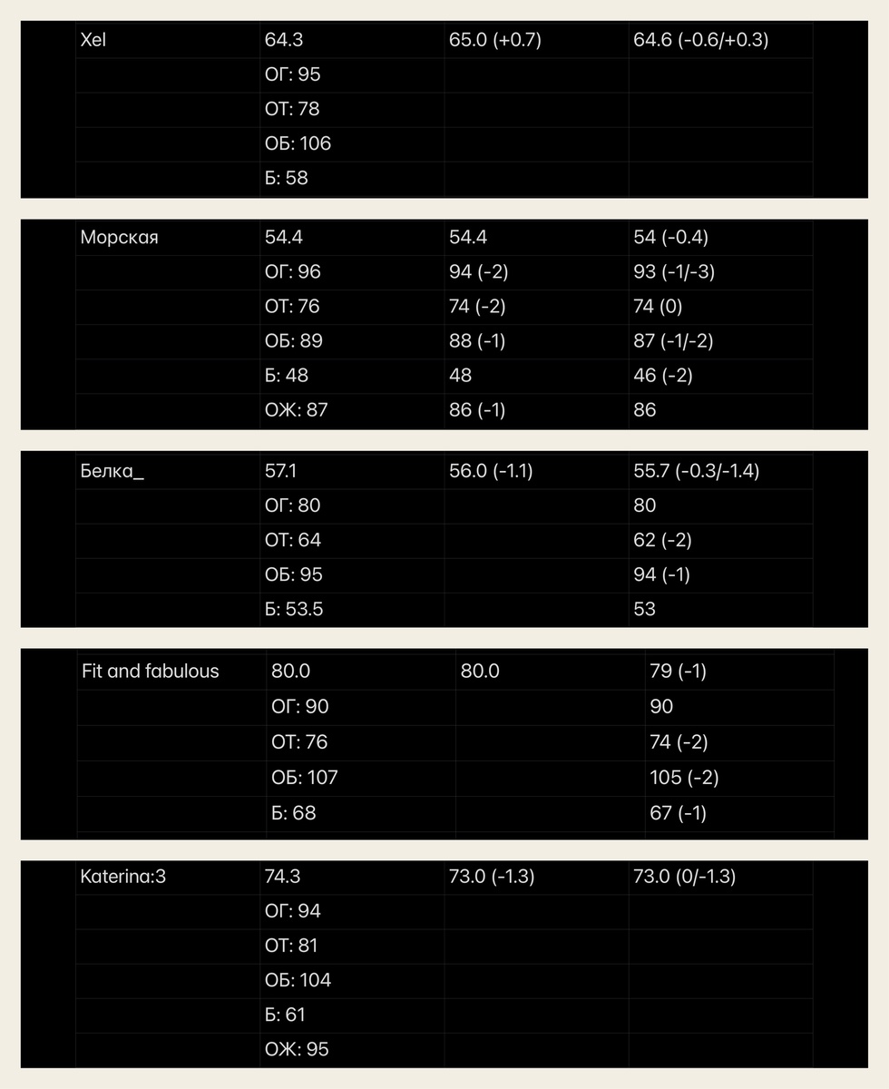 Кто не взвесился или не сделал замеры, можете прислать данные позже, и я добавлю или обновлю табличку🤗