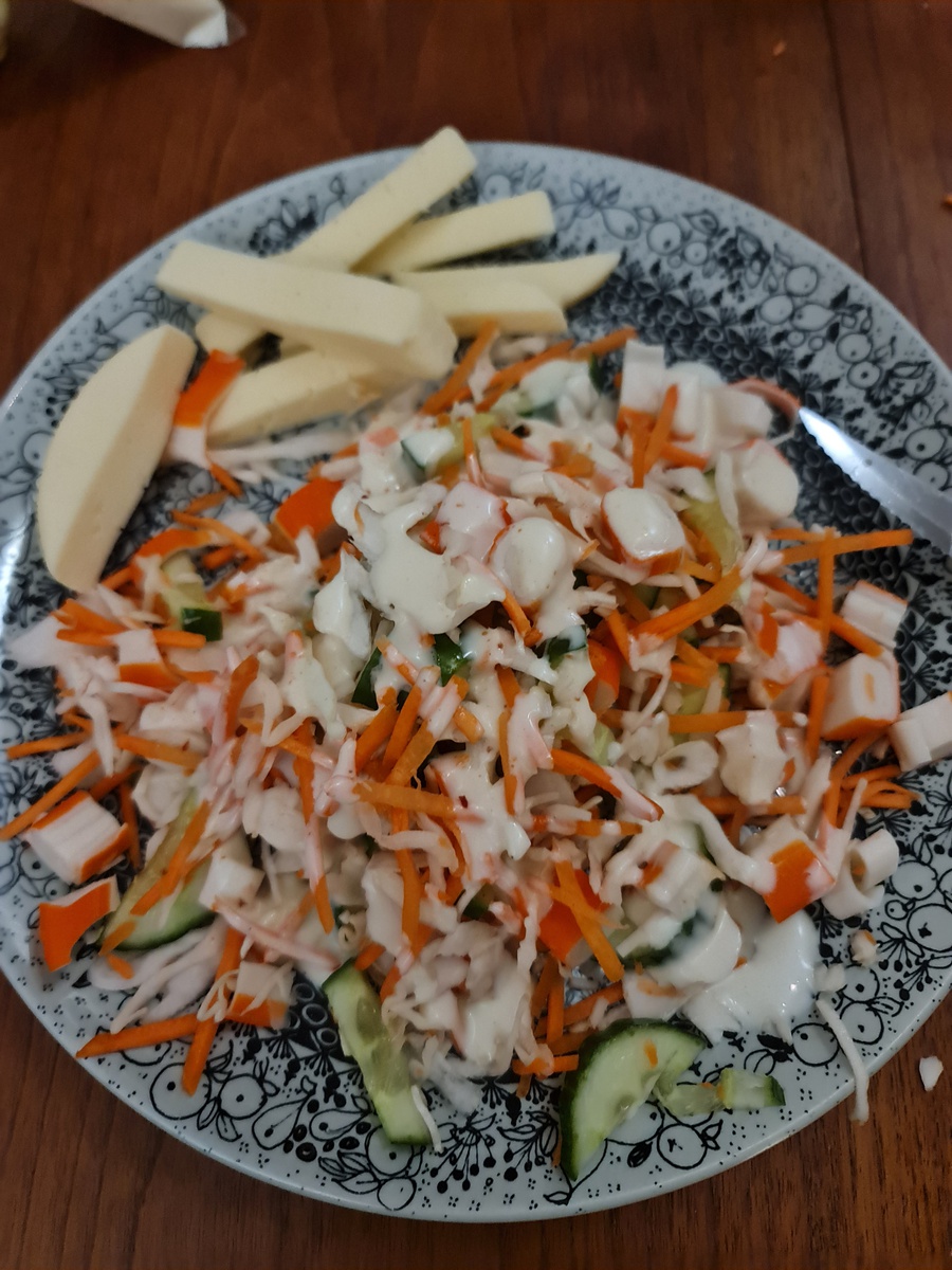 🥗 Салат очень вкусный и сытный получился: крабовые палочки, яйца, огурец, кукуруза, грецкие орехи, заправлено йогуртом.