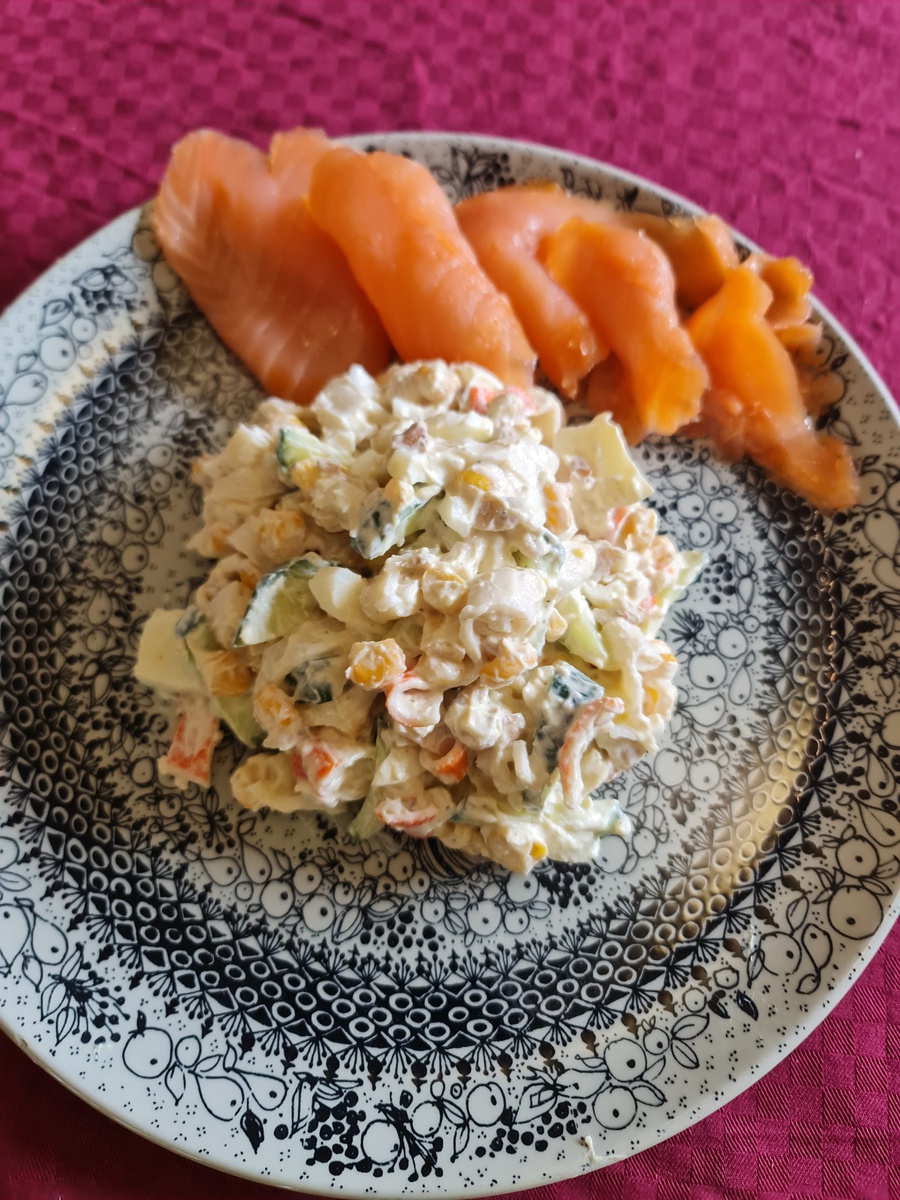 🥗 Салат очень вкусный и сытный получился: крабовые палочки, яйца, огурец, кукуруза, грецкие орехи, заправлено йогуртом.