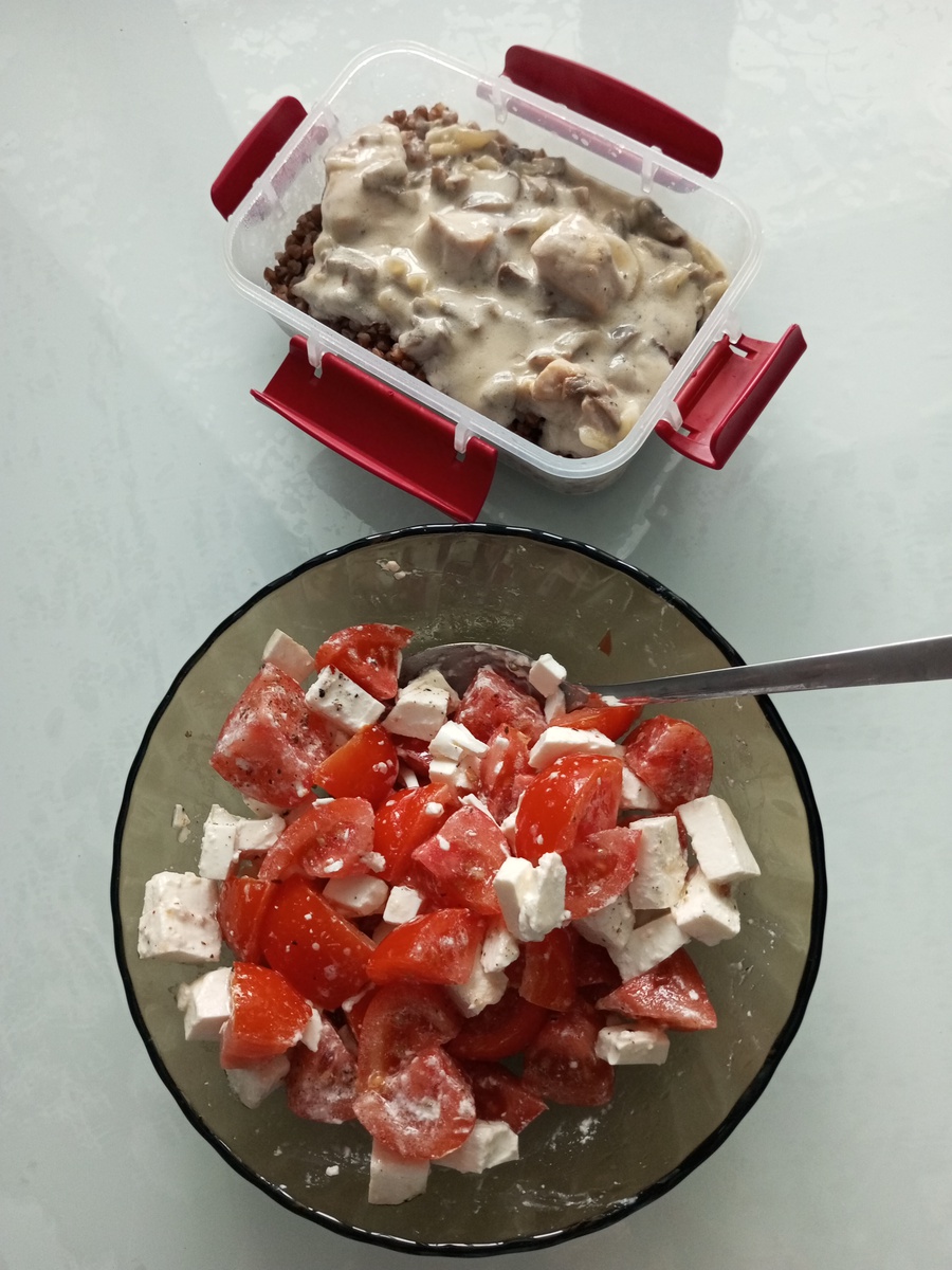☕ на обед гречка с курицей и шампиньонами в сметане, помидоры с фетакой, кофе с 2 вкусняшками. А хотелось слопать все рафаэлки в доме😇