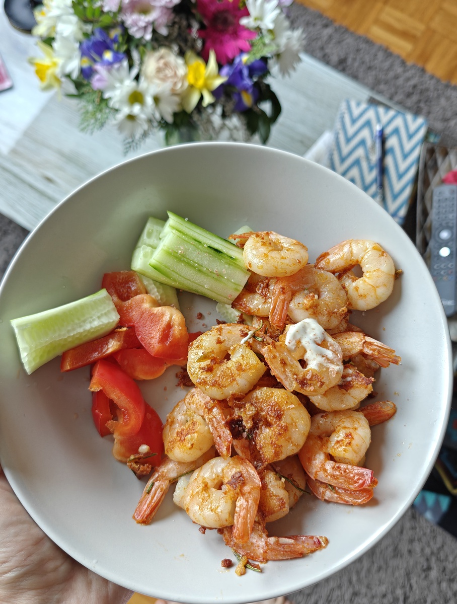 Обед: креветки жареные на сливочном масле с чесноком, соус из греческого йогурта и соевого соуса + огурец, немного перца и 2 бокала безалкогольного пива (примерно 0.4 всего) + яблоко.